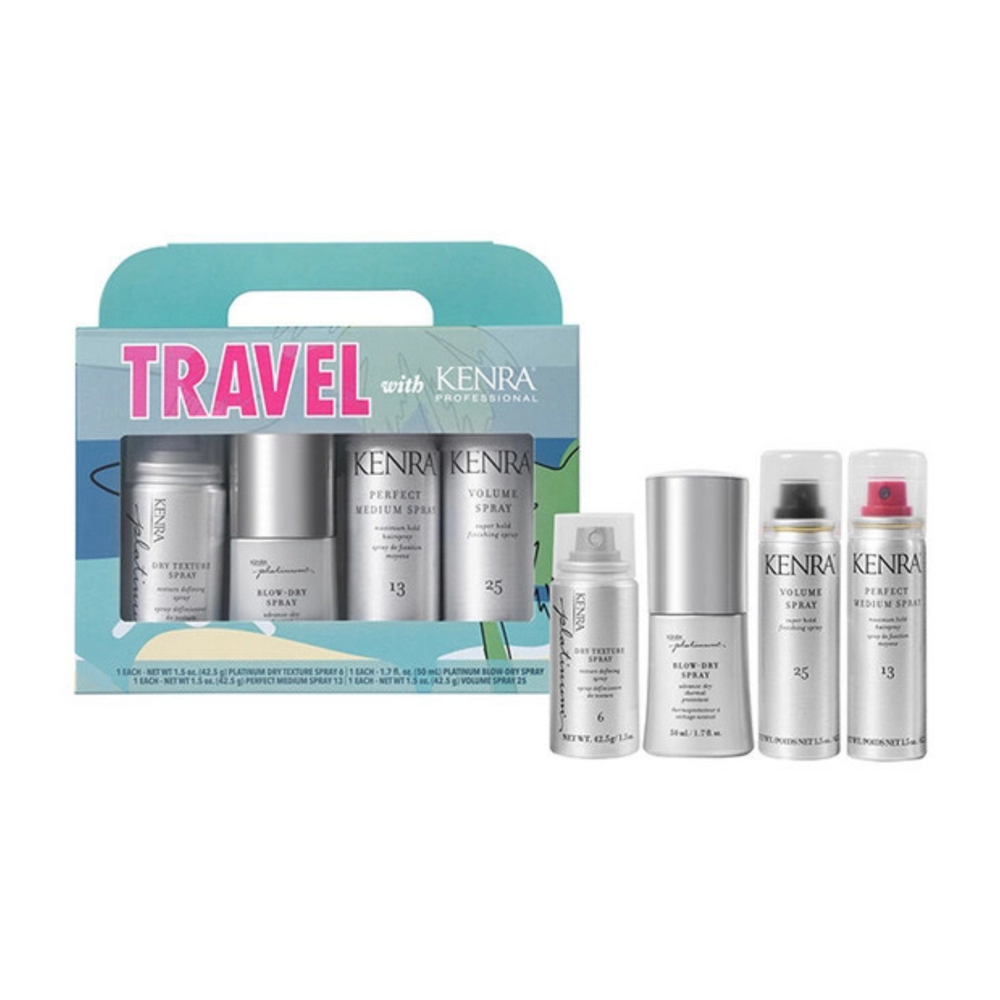 Kenra travel set – the dry texture spray gives instant volume, the blow dry spray cuts down styling time, the perfect medium spray holds any look, and the volume spray takes it to the next level. This travel set includes Blow-Dry Spray 1.7oz, Dry Texture Spray 6 1.5oz, Perfect Medium Spray 13 1.5oz and Volume Spray 25 1.5oz.