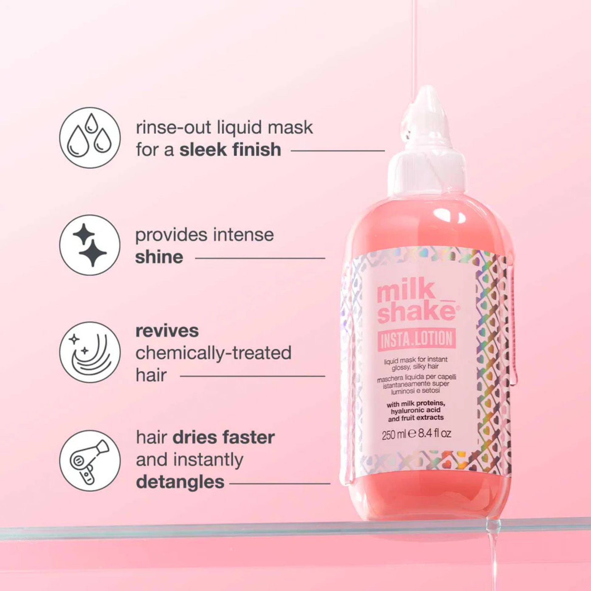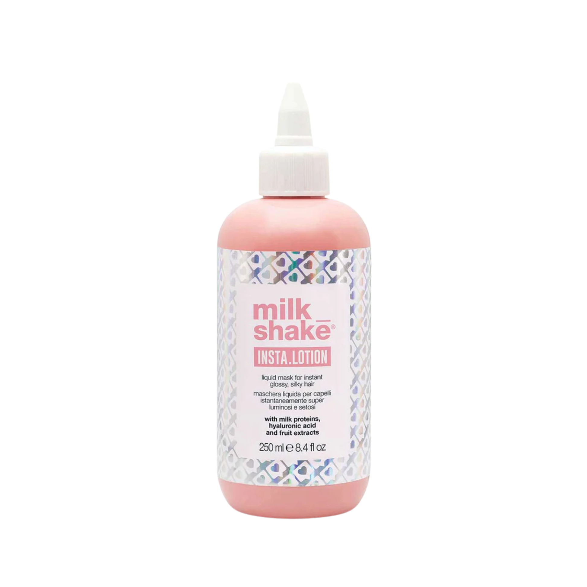 milk_shake insta.lotion delivers instant, intense shine thanks to milk proteins, fruit extracts, and other nourishing ingredients. Formulated for dry or chemically-treated hair, it includes hyaluronic acid to restore hydration and promote a smooth, sleek finish. Reveal hair that’s radiant, revitalized, and lightly scented with a fresh, peachy fragrance.