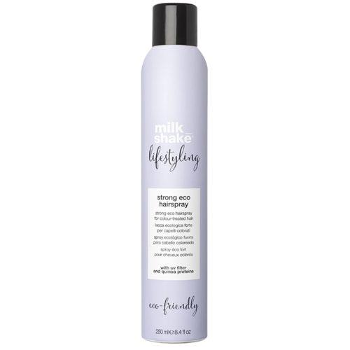 milk_shake® lifestyling strong eco hairspray is an eco-friendly hairspray with extra strong hold that gives structure plus exceptional shine. Formulated specially for color-treated hair, it protects hair from humidity and external aggressors, maintaining the hair’s volume and style. Quick to dry, it is easily brushes out without leaving a residue.