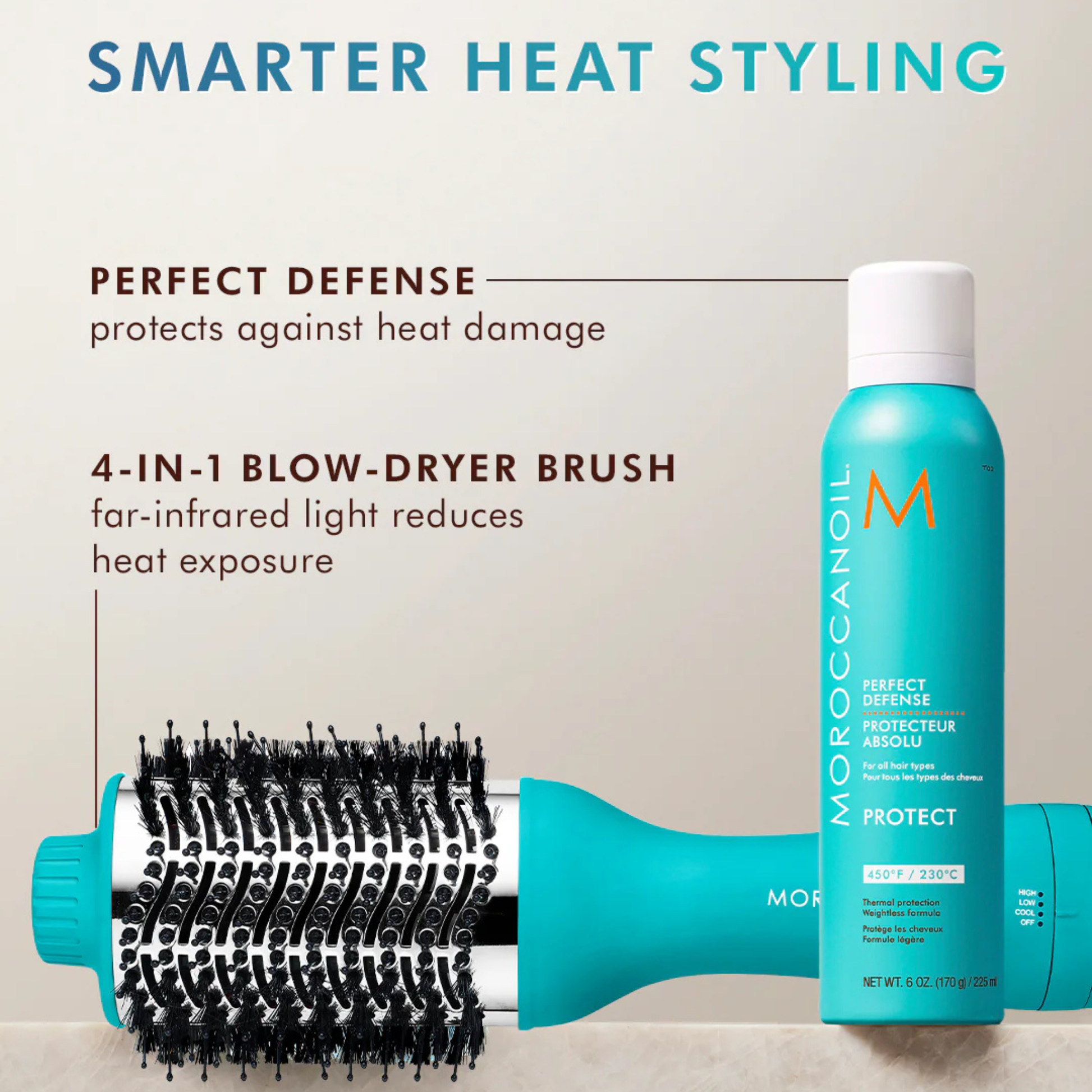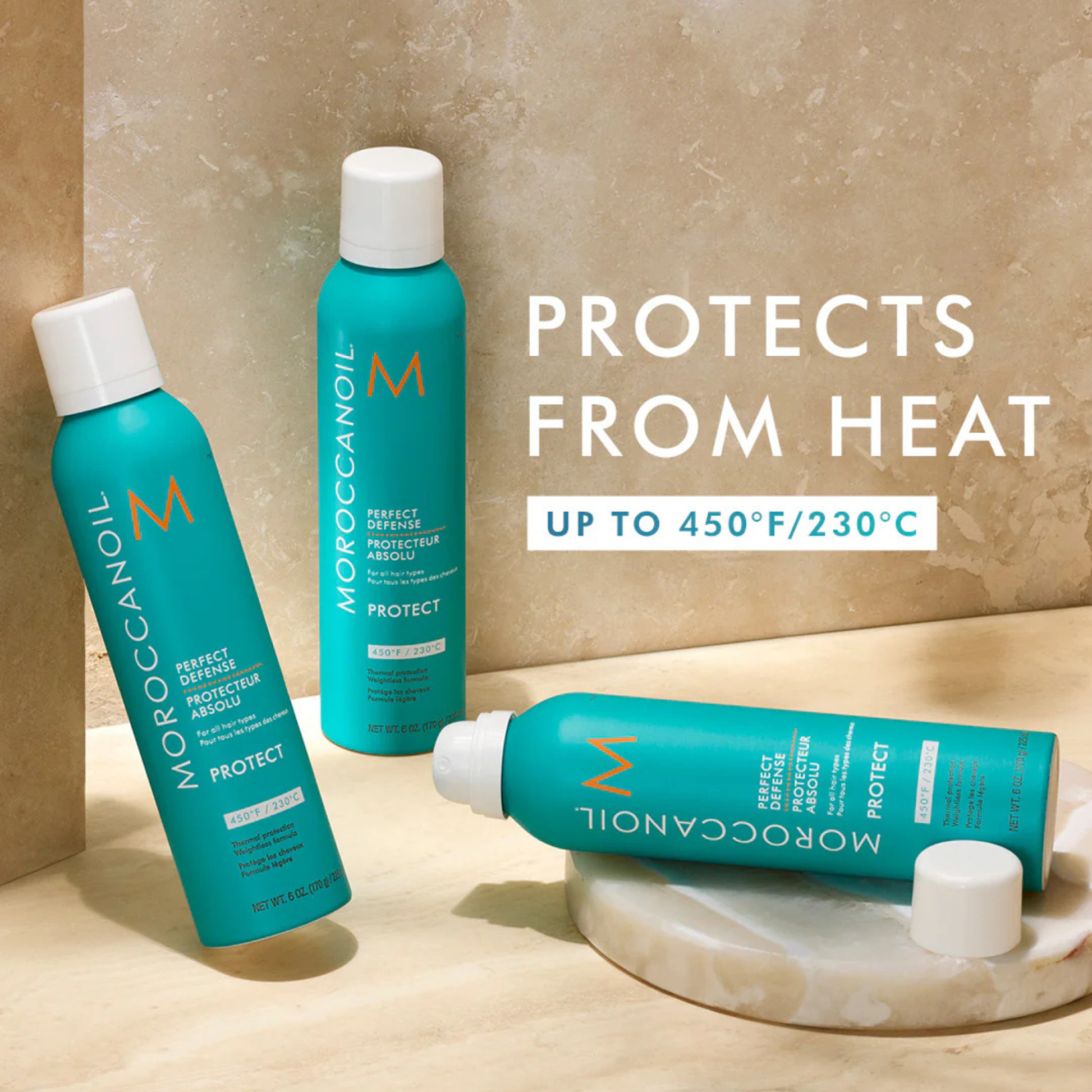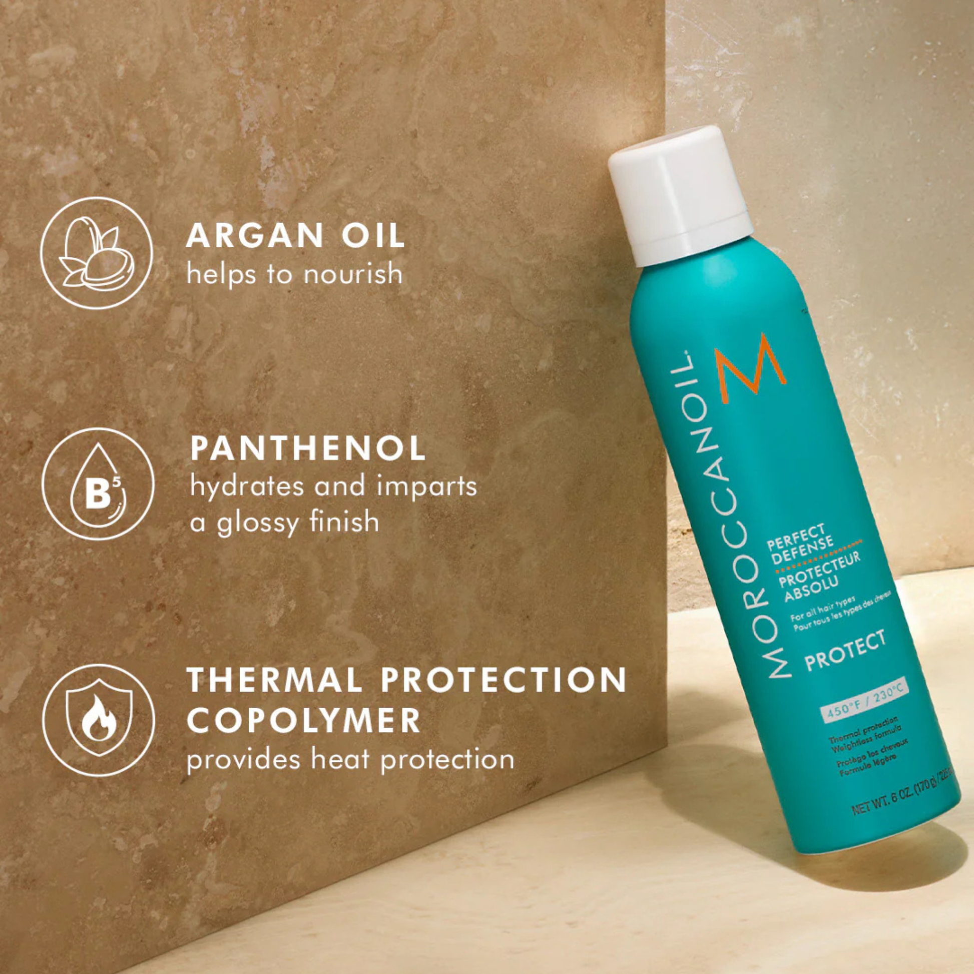 Moroccanoil® Perfect Defense is a lightweight, dry aerosol heat protectant that shields hair from heat styling damage up to 450°F / 230°C. Powered by nourishing argan oil and vitamins, this conditioning formula helps rehydrate hair while keeping it protected, soft, and healthy-looking during styling.