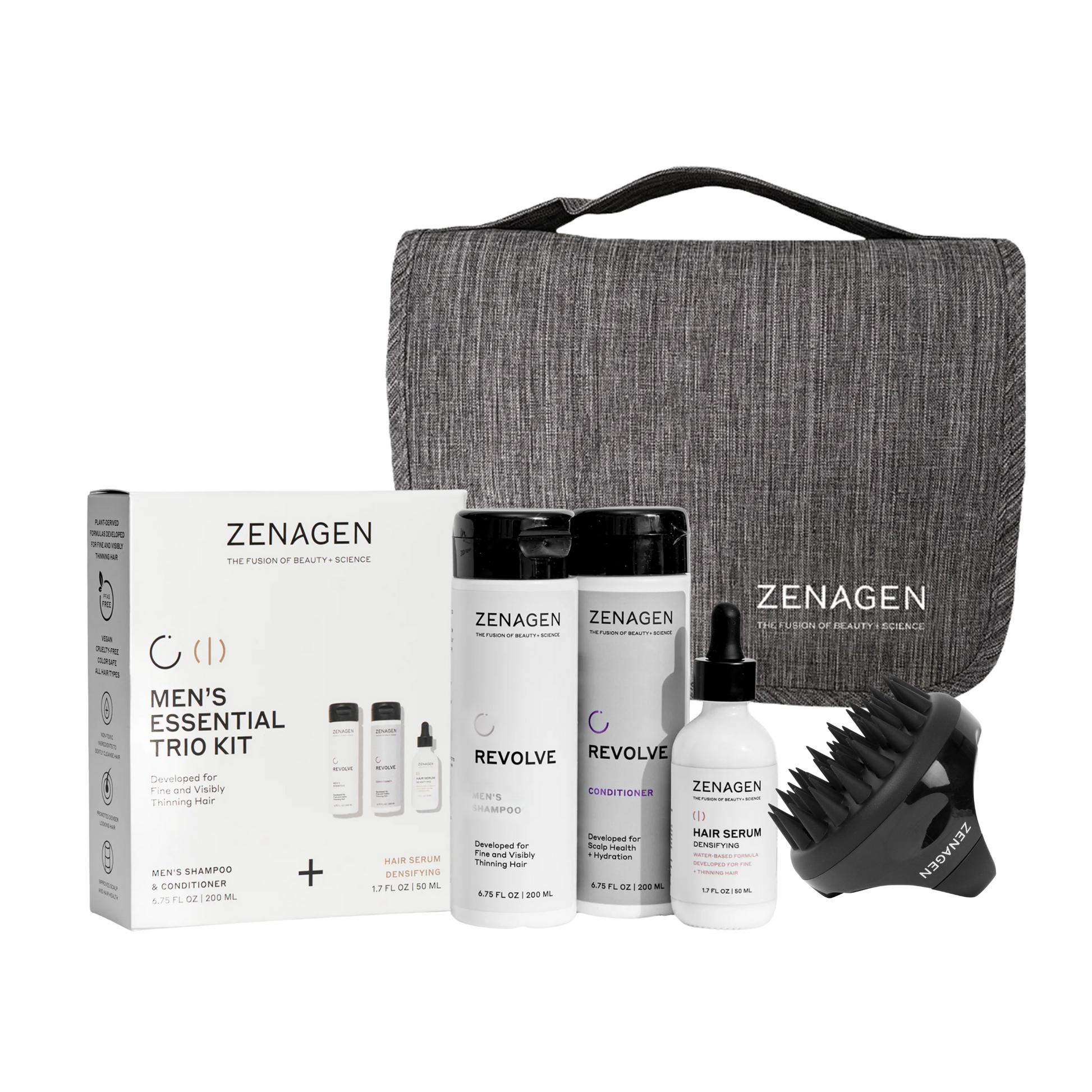 This three-step kit features signature Revolve Shampoo for Men, the newly added Revolve Conditioner, and the Densifying Hair Serum, plus Scalp Massager, and Hanging Travel Bag—working together to gently cleanse, hydrate, and add visible volume without heavy buildup or harsh ingredients.